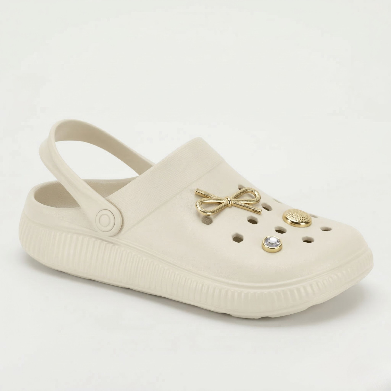 Design Charmoso: O tom Off White traz uma elegância neutra, complementada por pins (enfeites) dourados e com pedrarias que adicionam um brilho especial e feminino ao cabedal.