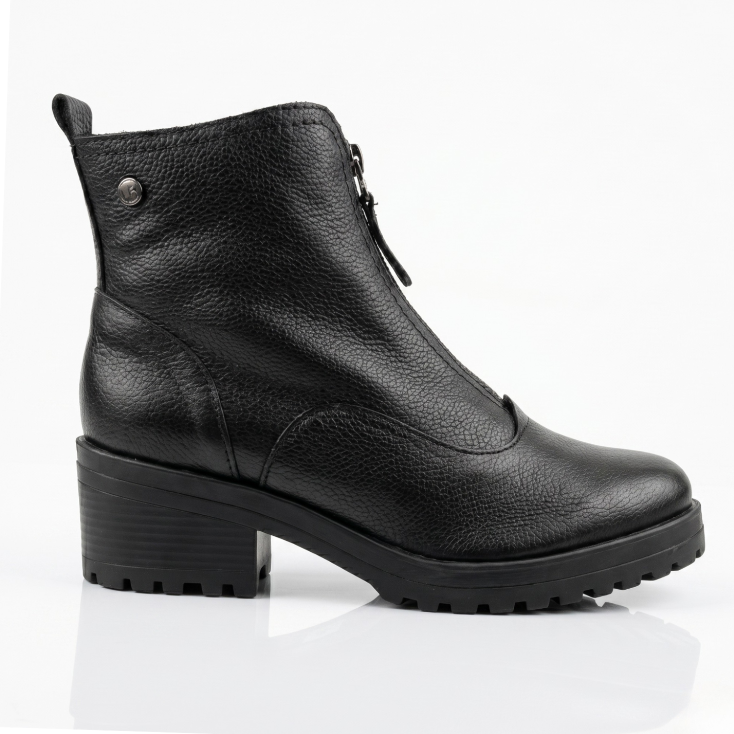 O destaque fica para o seu fechamento frontal em zíper, que além de conferir um ar contemporâneo e prático, facilita o calce junto ao puxador traseiro. Internamente, o forro em couro cru e a palmilha têxtil acolchoada garantem que seus pés fiquem confortáveis durante todo o dia.