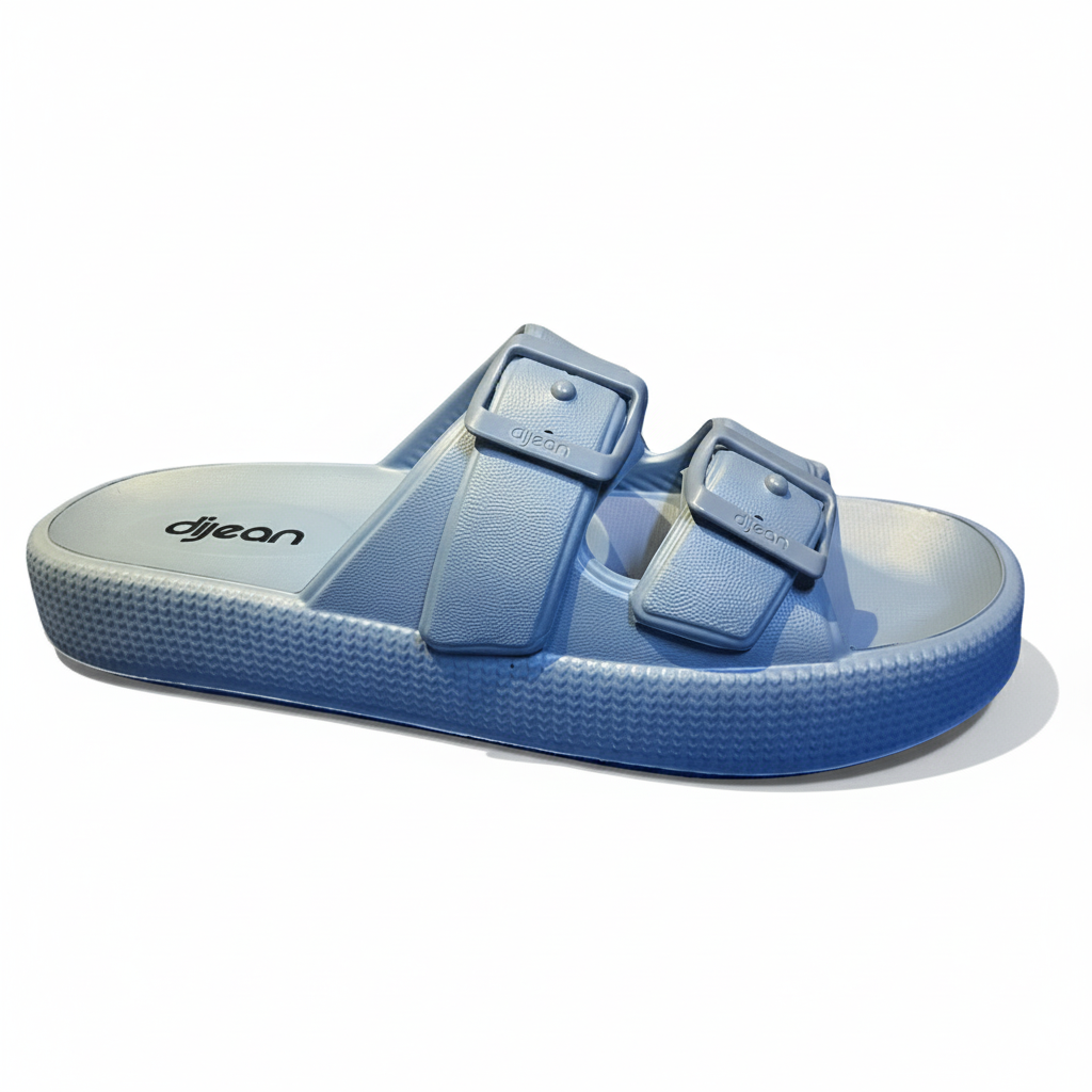O design atual apresenta duas fivelas com regulagens na parte superior, permitindo um ajuste perfeito e personalizado aos seus pés. A cor "Jeans" traz uma proposta casual e versátil, que se integra facilmente a diversas composições.