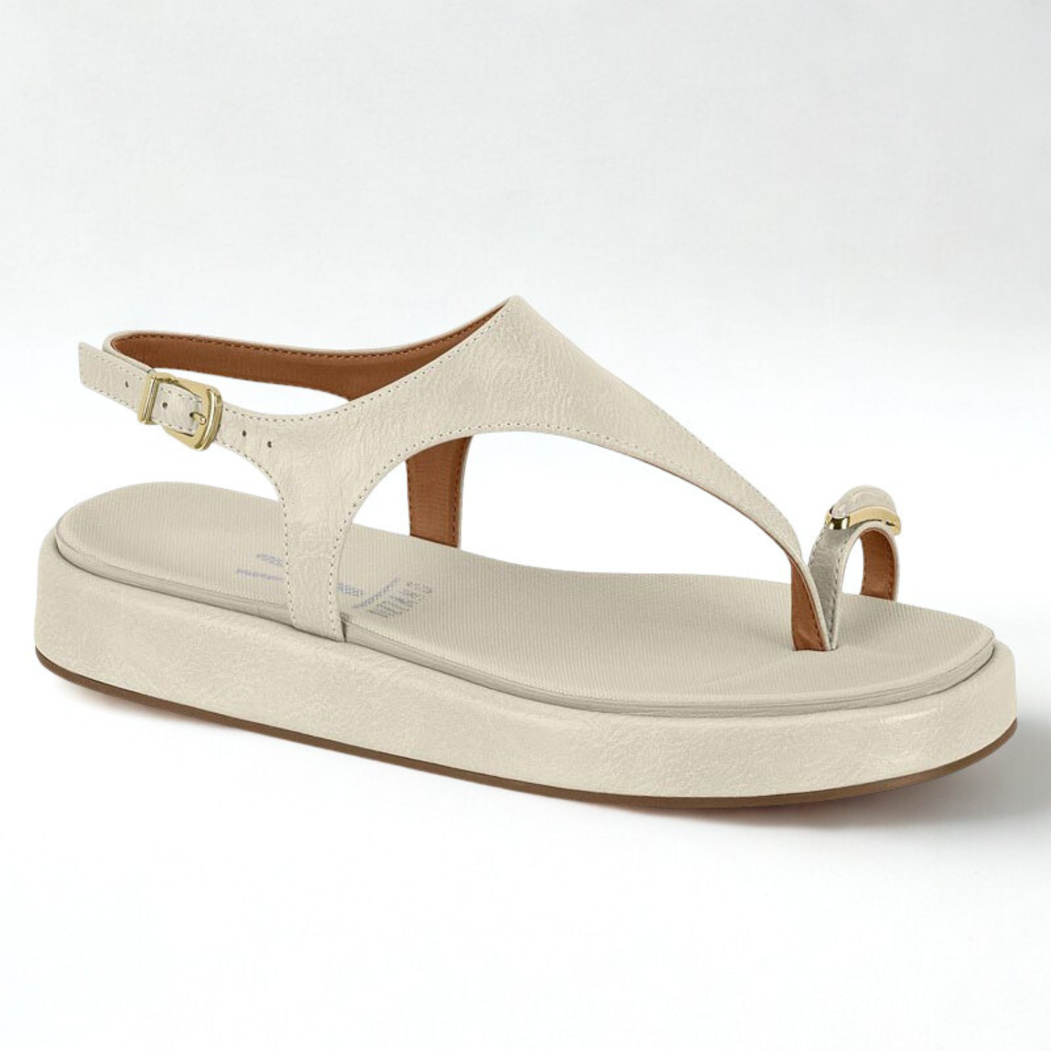 Confeccionada em material Napa Calf de alta qualidade, a sandália possui um toque macio e acabamento impecável. O modelo conta com um charmoso anel para o dedo, que além de ser um detalhe de estilo, proporciona maior segurança ao caminhar. O ajuste é garantido pela prática fivela regulável na parte traseira, adaptando-se perfeitamente aos seus pés.