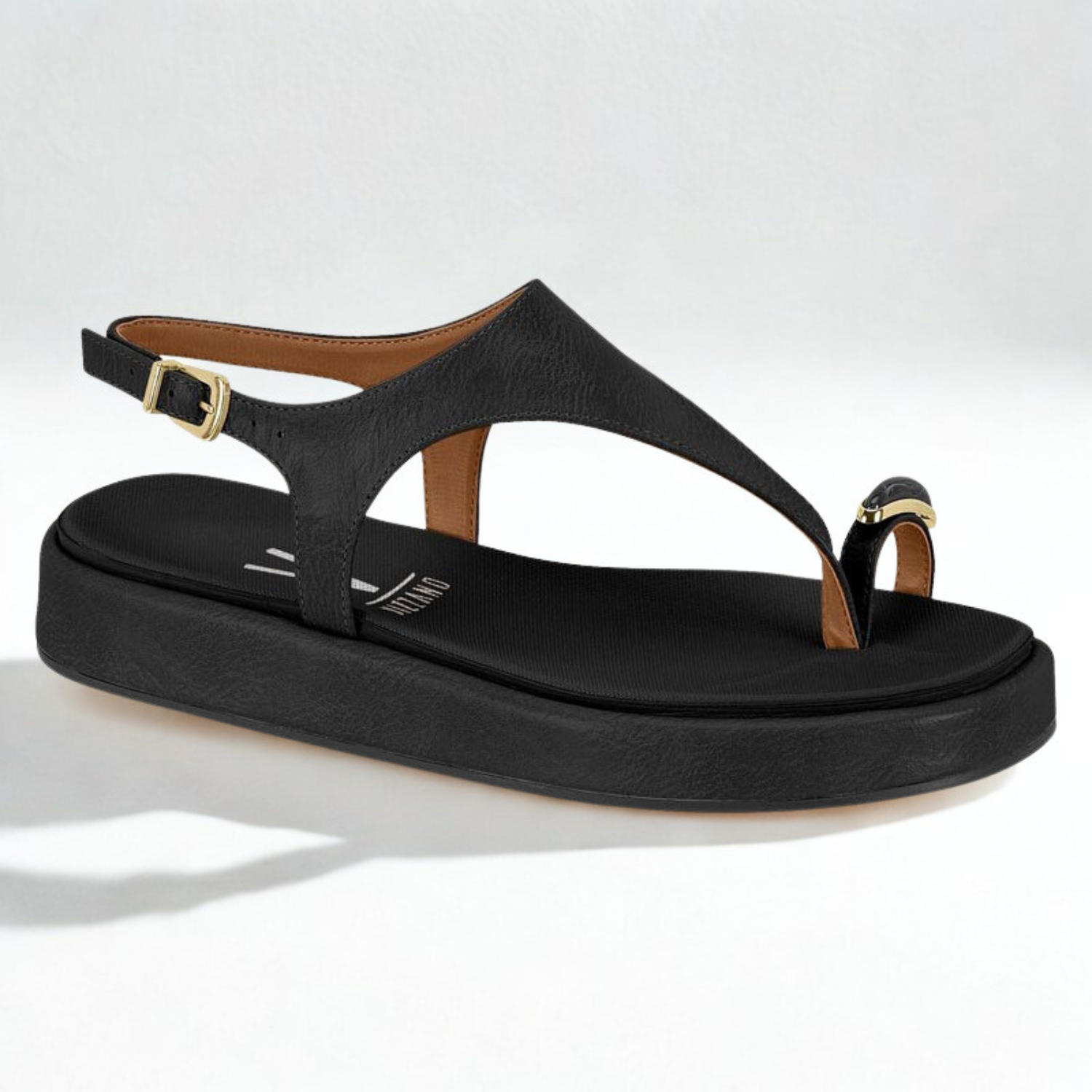 O modelo conta com um elegante anel para o dedo, um detalhe que valoriza os pés e confere um toque de exclusividade ao visual. O cabedal, confeccionado em material Napa Calf sintético de alta qualidade, proporciona um acabamento refinado e macio ao toque. O ajuste é garantido pela prática fivela regulável na parte traseira, que oferece segurança e firmeza ao caminhar.