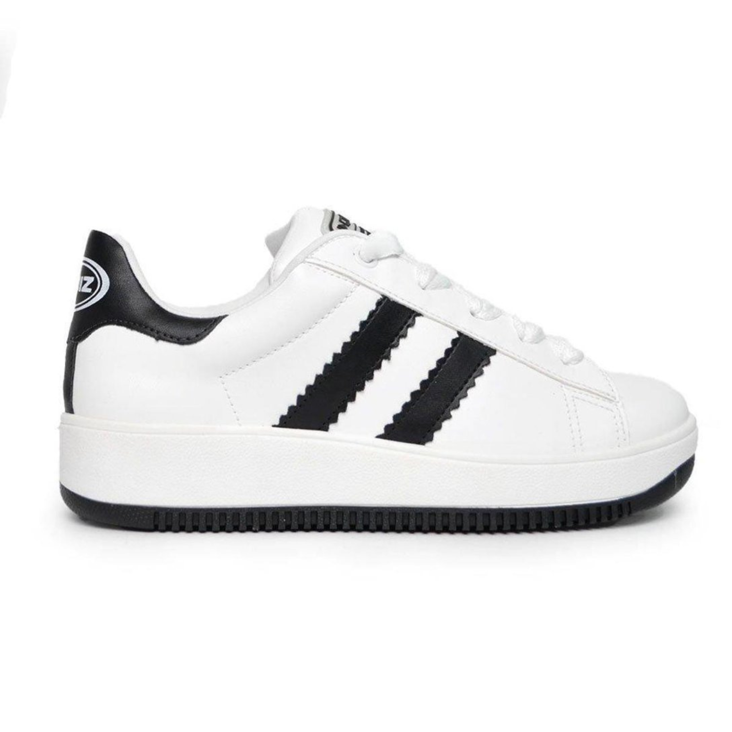 Seu cabedal é feito de material sintético branco, complementado por duas listras pretas laterais e um acabamento em preto no calcanhar, criando um visual moderno e elegante. O solado, também nas cores preto e branco, é costurado para maior durabilidade e resistência.